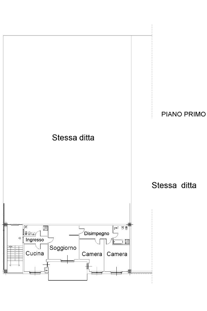 Il piano primo,può anch’esso essere accessibile carrabilmente, è caratterizzato da ampie vetrate che garantiscono un’ottima luminosità e visibilità. Su questo livello si sviluppa un ampio locale ad uso magazzino, un ulteriore vano utilizzabile come ufficio e un servizio igienico. Sempre al piano è presente l’accesso al vano scala con porta tagliafuoco, che conduce sia al piano terra sia all’unità abitativa.