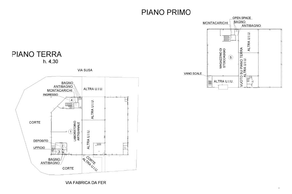Al piano terreno si trovano due locali ad uso ufficio, due servizi igienici con antibagno e un ampio vano destinato a laboratorio. L’accesso è particolarmente funzionale grazie alla presenza di quattro ingressi indipendenti, carrai dotati di portelloni automatici con meccanismo scorrevole, oltre a quattro pedonali cosi da consentire l’ingresso diretto all’area produttiva. L’altezza massima di una delle aperture è di circa 3,80 metri. Sul medesimo livello è presente un vano scala di ampia metratura che collega il piano terra al piano primo. Nella parte retrostante è inoltre presente un vano grezzo, predisposto per un eventuale installazione di un montacarichi.