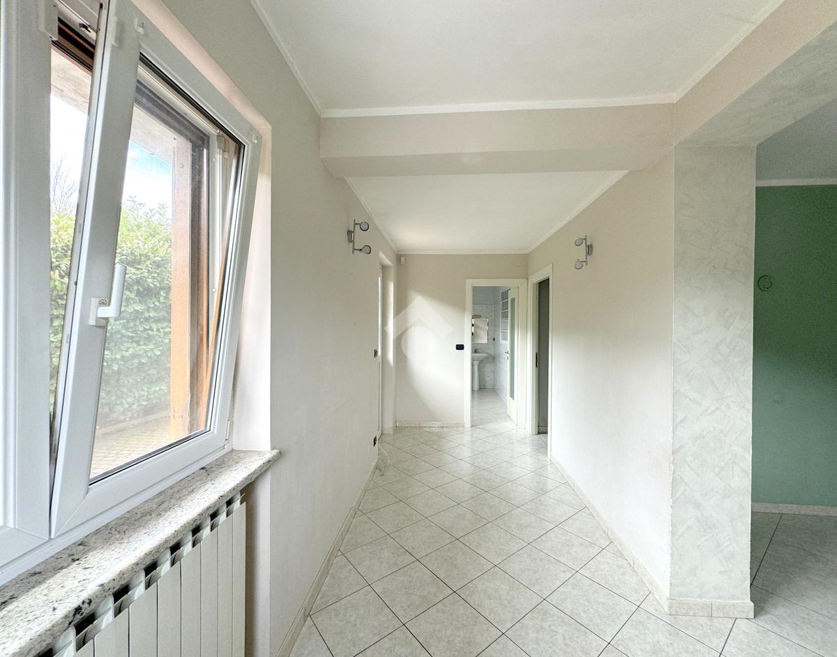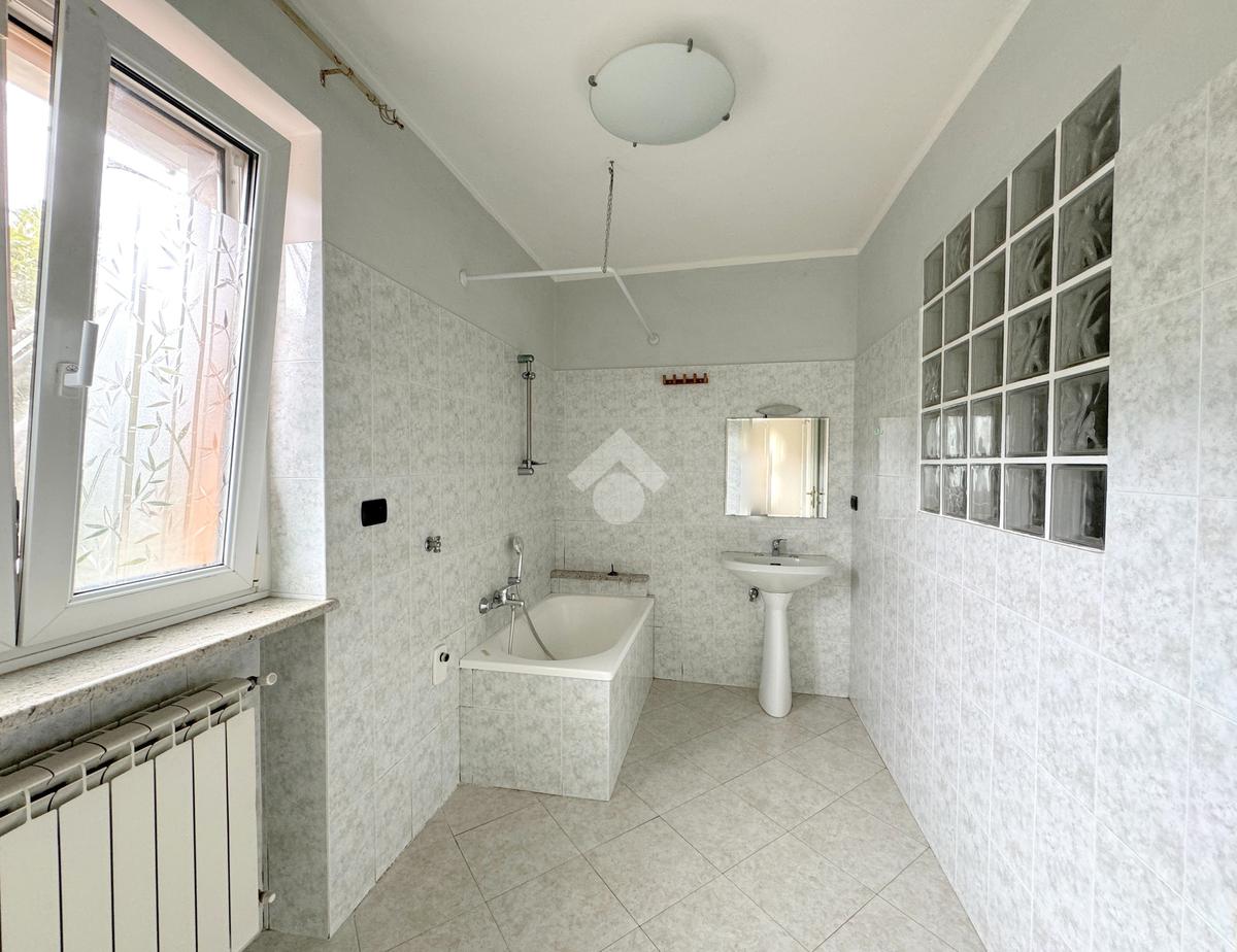 Sono presenti due bagni finestrati, di cui uno con doccia. La zona notte è composta da due camere da letto, una matrimoniale con cabina armadio l’altra è singola entrambe con accesso dai due disimpegni. Tramite scala interna si accede al piano inferiore dove si trovano lo spazioso box auto e la cantina. All’esterno troviamo il giardino privato con il posto auto. Il riscaldamento è autonomo a metano. L'appartamento attualmente è arredato in quanto è abitato dal proprietario, il mobilio non è compreso nella vendita.